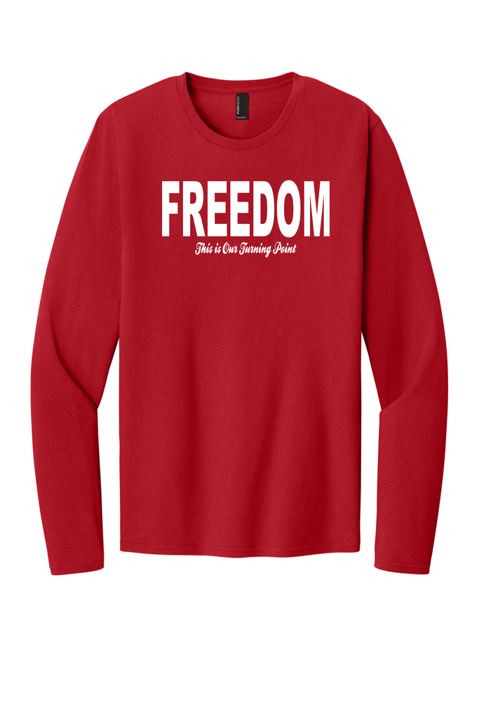 Gildan Red long sleeved shirt with a military flag on the right sleeve with the words freedom across the front full flag on the back